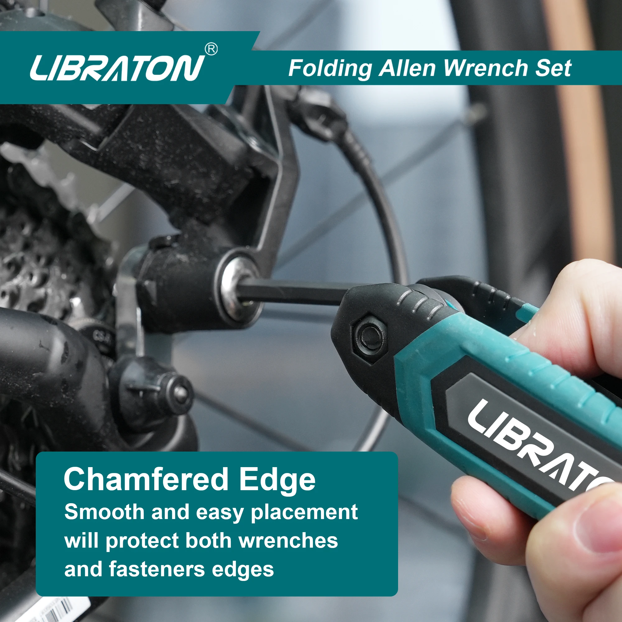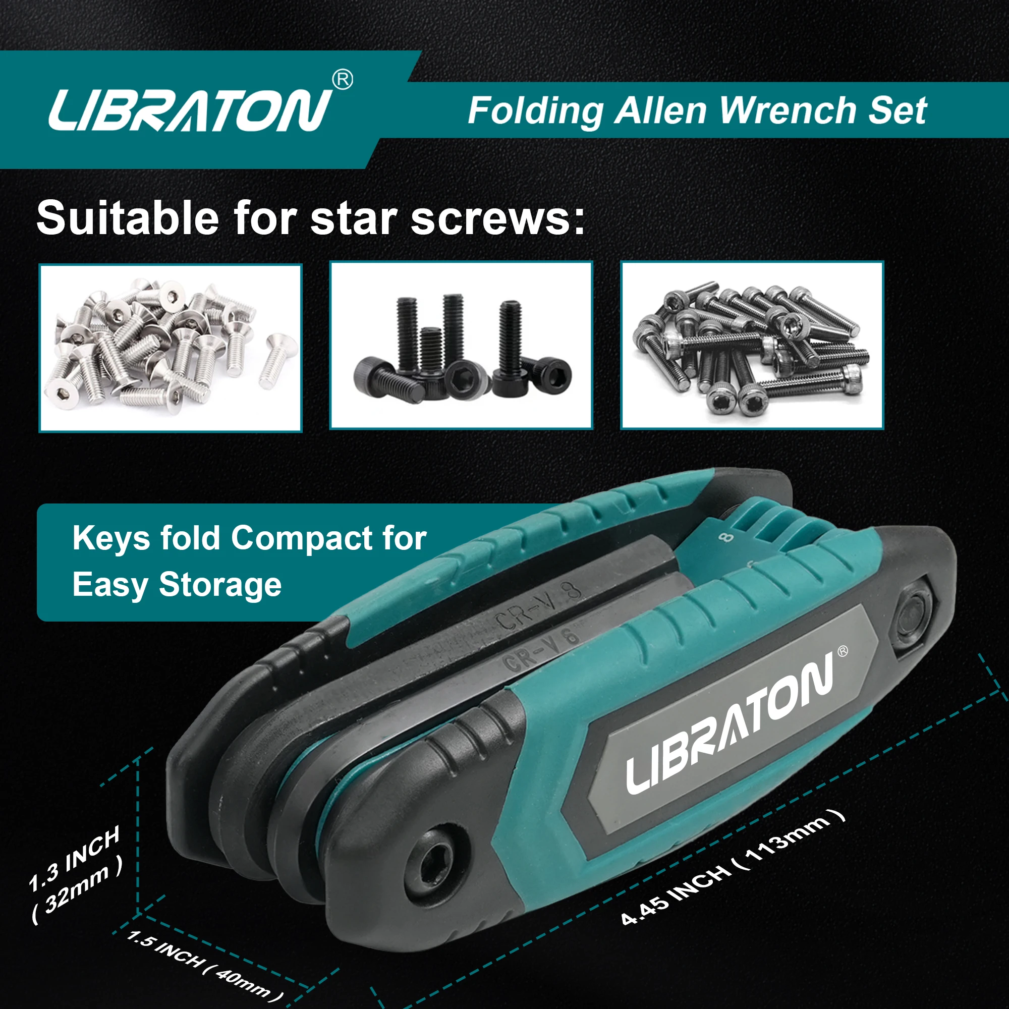 LIBRATON Folding Hex End Key Set apresenta cabeça flexível allen, design dobrável compacto, alça confortável de material duplo, marcações de tamanho facilmente identificadas e ajuste perfeito para parafusos e cabeças de parafuso. Ele entra em espaço apertado onde tradicional chave sextavada reta não poderia alcançar qualquer torque eficaz.
